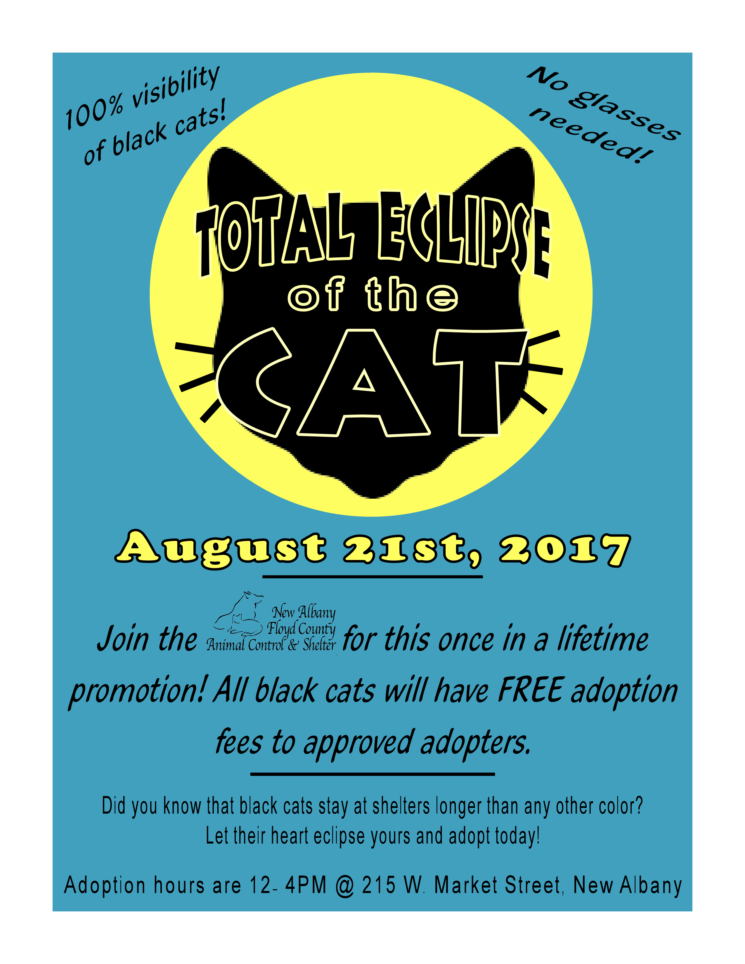 August 21st, 2017 will be a unique day. There will be a total eclipse of the cat at the New Albany Floyd County Animal Shelter. Walk into the shelter, no glasses required, and watch as your heart aligns with those of the cats seeking a home.