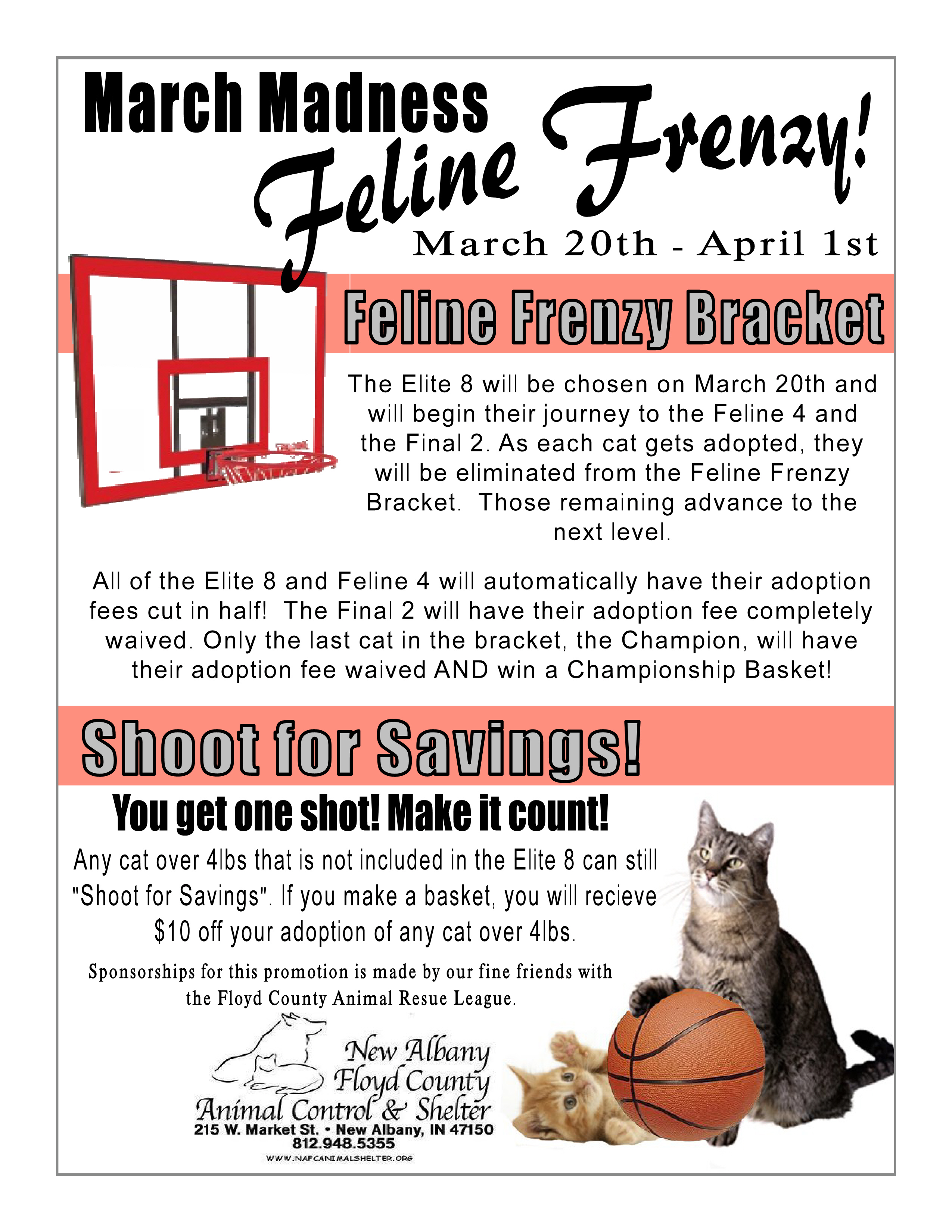 To help promote adoptions and reduce overcrowding, the Shelter is embracing basketball madness and holding our March Madness Feline Frenzy. This promotion will be held March 20th through April 1st.