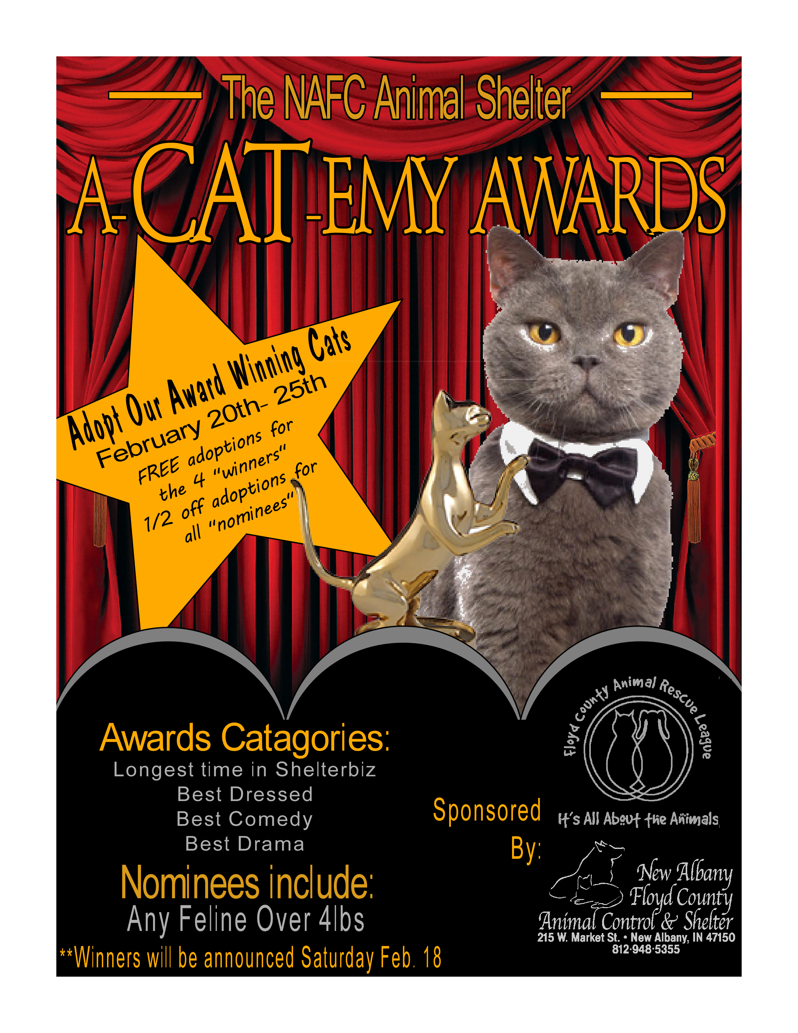 Welcome to the 2017 New Albany Floyd County Animal Shelter A-CAT-EMY Awards! Our beautiful adoptable cats are ready to dazzle adopters with their stunning personalities and shelter performances in hopes of winning an A-CAT-EMY Award!