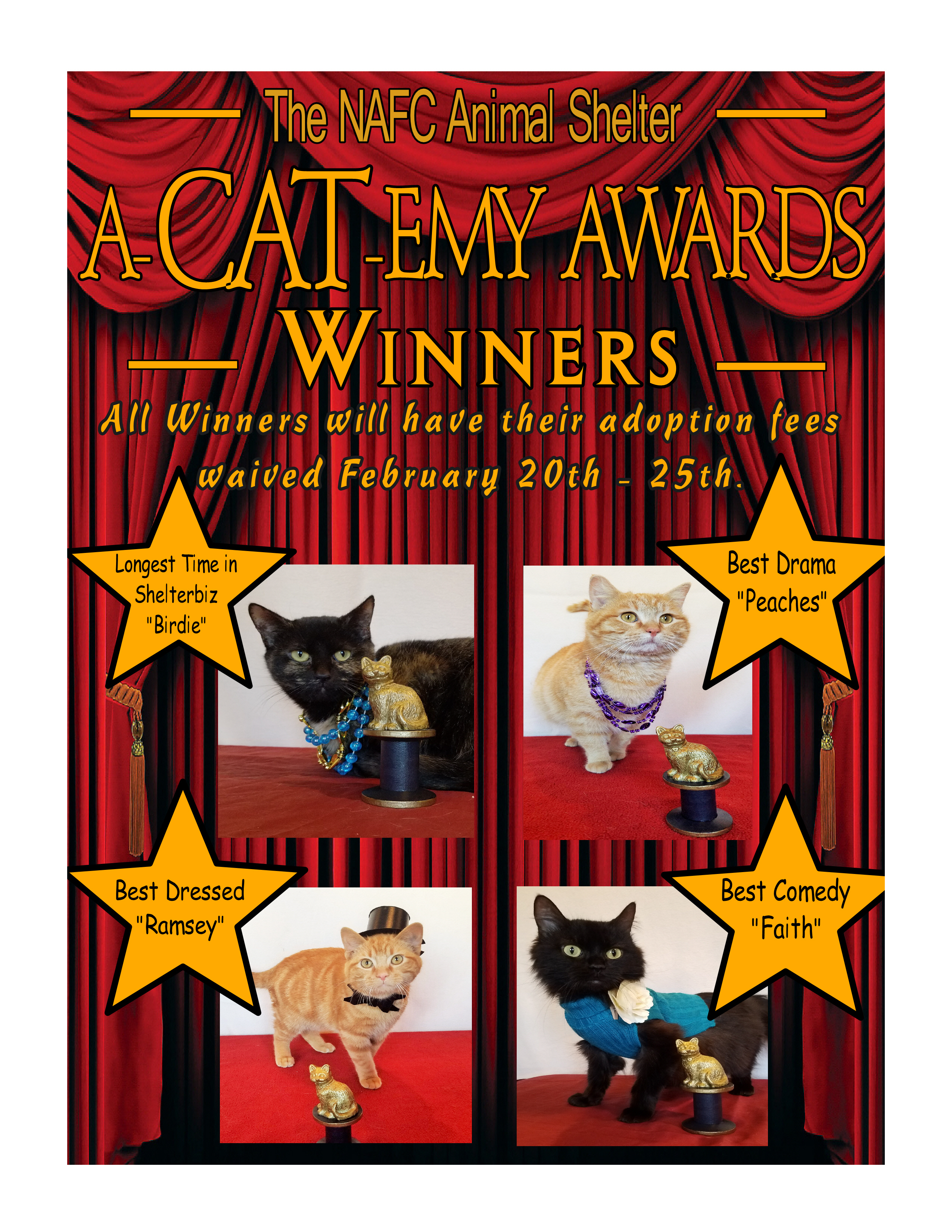 Join us February 20th through the 25th for an award show unlike any other. Fur coats will be the hottest style on this red carpet! Four CATegories are up for grabs – Longest Time in Showbiz, Best Dressed, Best Comedy, and Best Drama. The four winners will receive a new home with no adoption fees! All other nominees will receive half off of their adoption fee! Only cats that weigh over 4lbs will be considered for the awards. We have narrowed down the “Best Dressed†to only two cats, but we need your help choosing. Visit our Facebook page and vote! All winners will be announced February 18th. Look for pictures of the red carpet styles on our Instagram account, nafcanimalshelter.