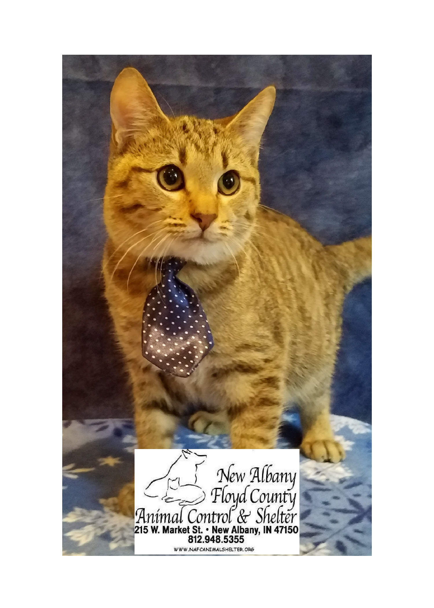 Little Bart is all dressed up with no where to go! He has been at the Shelter for nearly 3 months waiting for a new home. He is a gentle and playful 6 month old male. When him and his friends first came to us, they were extremely fearful. Over time, they have made great strides in their social skills! He is already neutered, microchipped, Felv/FIV tested negative, and current on vaccinations. His adoption fee is only $20. Visit him at the New Albany Animal Shelter today! More adoptable animals can be seen by clicking the “Adoptable Animals” tab above!