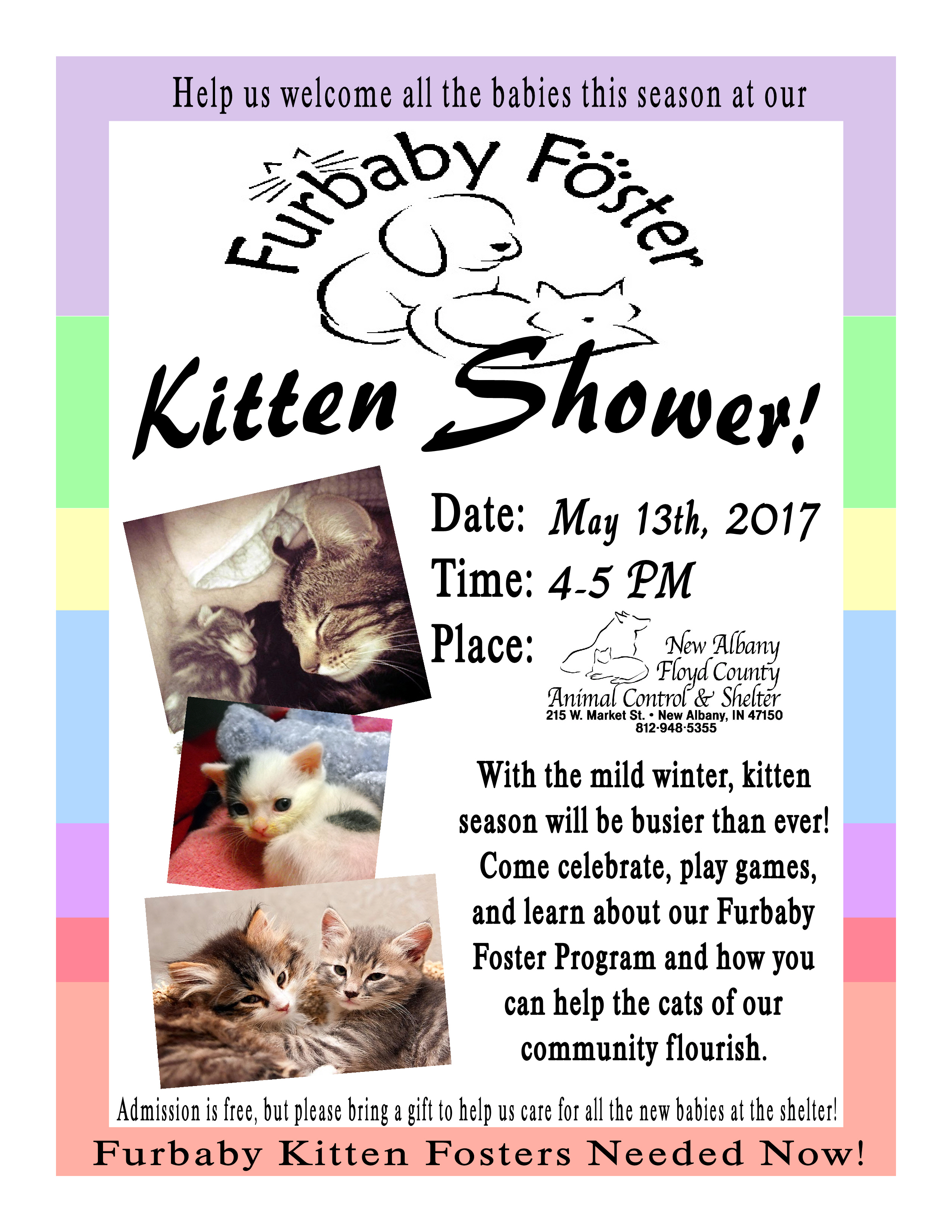 To welcome all of the new furbaby families and fosters, the New Albany Floyd County Animal Shelter is hosting a Furbaby Kitten Shower on Saturday, May 13th  from 4-5 PM. Come and enjoy lots of shower games, refreshments, and of course kittens! Families can also sign up to become Furbaby Fosters! Admission is free, but a donation to welcome the new babies would be appreciated.