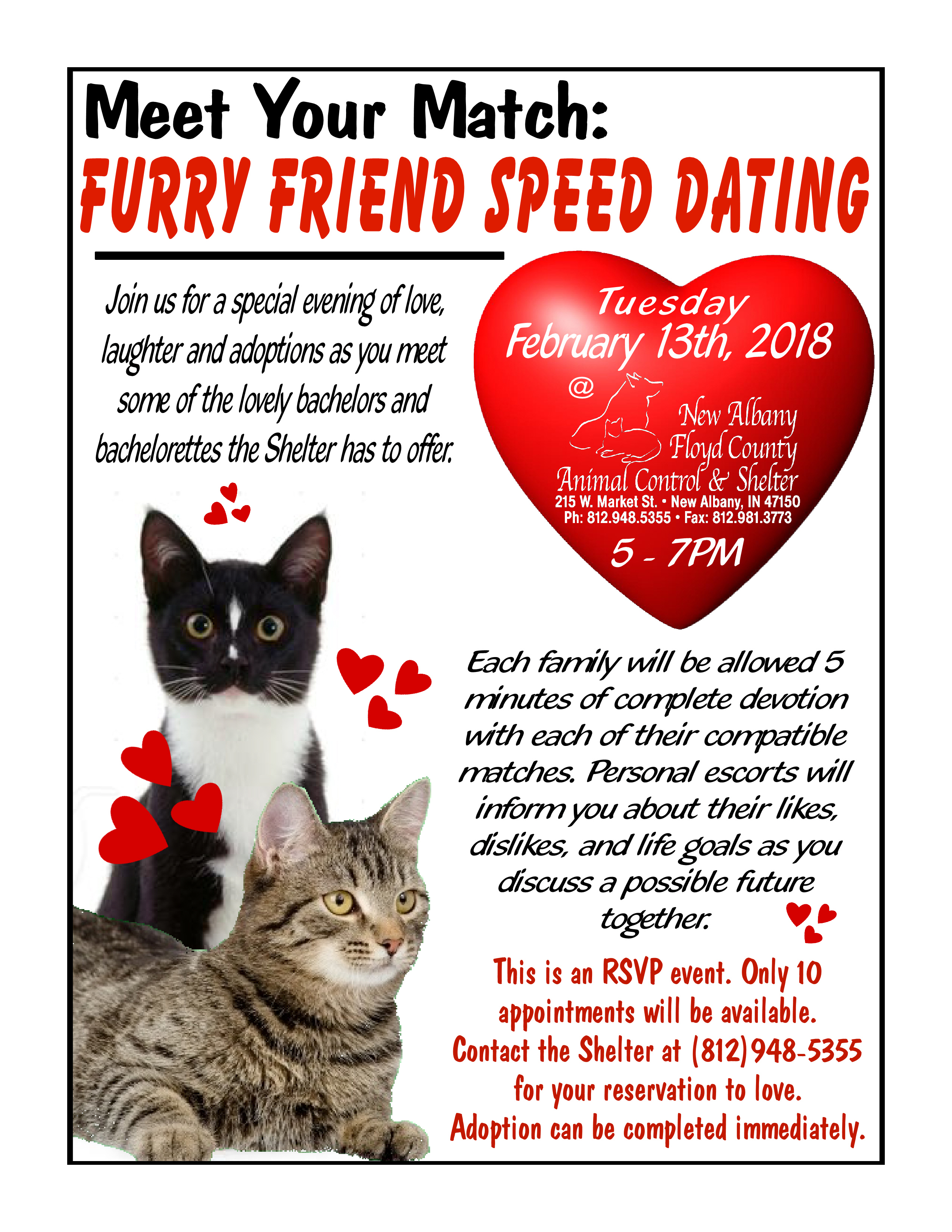 Valentine’s Day is nearly here, and many pets at the New Albany Animal Shelter still do not have Valentines!  Join us for a special after hours evening of love, laughter, and adoptions at Shelter Speed Dating on February 13th, 2018 between 5 and 7PM.